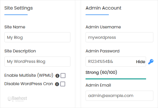 • Admin Username: Your new WordPress username (for security reasons, do not use the administrator or the admin username).