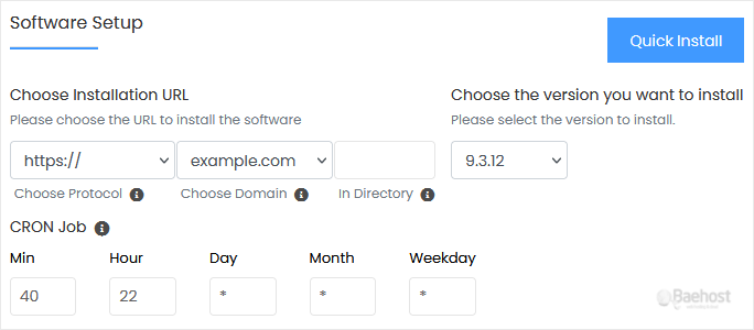 • Choose Installation URL: Choose the appropriate protocol/domain. Inside the "In Directory" field, should you want to install this in a directory, i.e., example.com/directory, enter the directory name. Otherwise, please, leave it blank to install in your main domain, i.e., example.com.